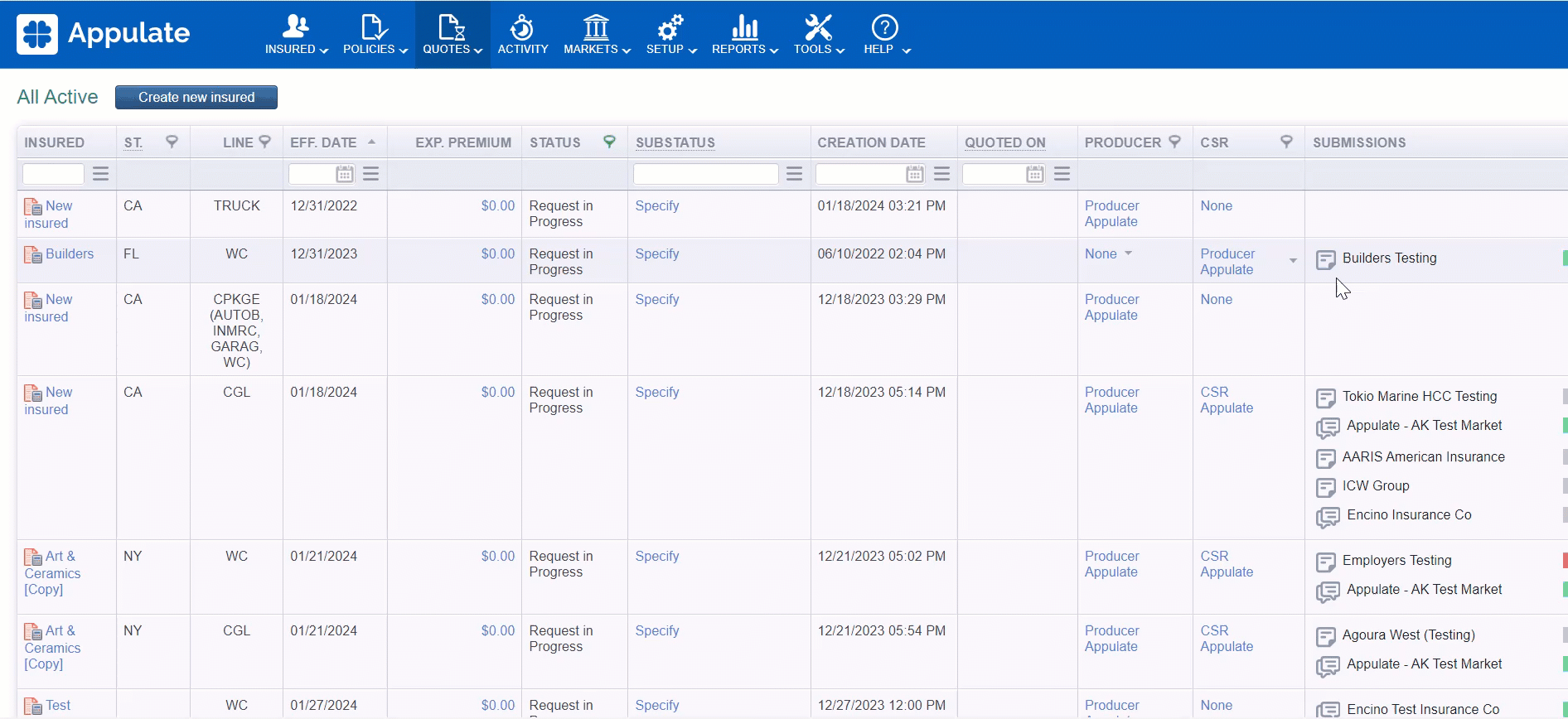 - quote request and policy records;