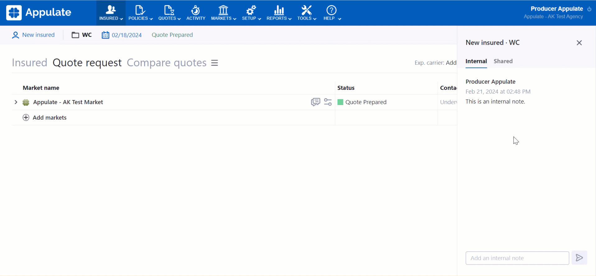 Tip: For a quote request or policy, you can leave either an internal or a shared note. Just leave your note on the Internal or Shared tab depending on the type of note you want to add.
