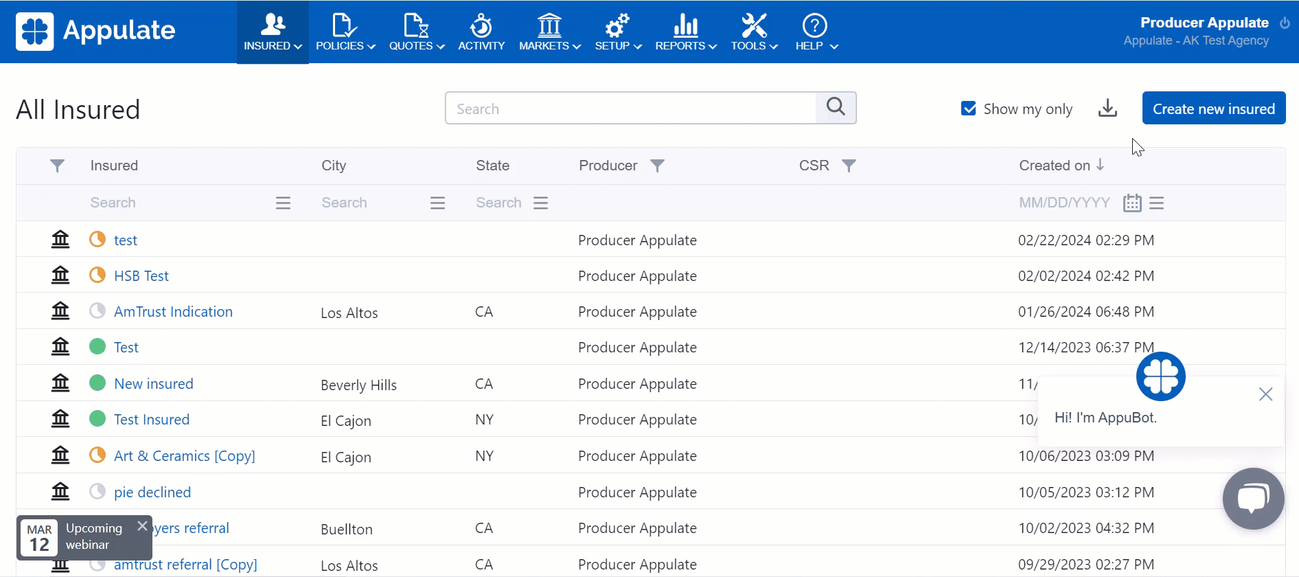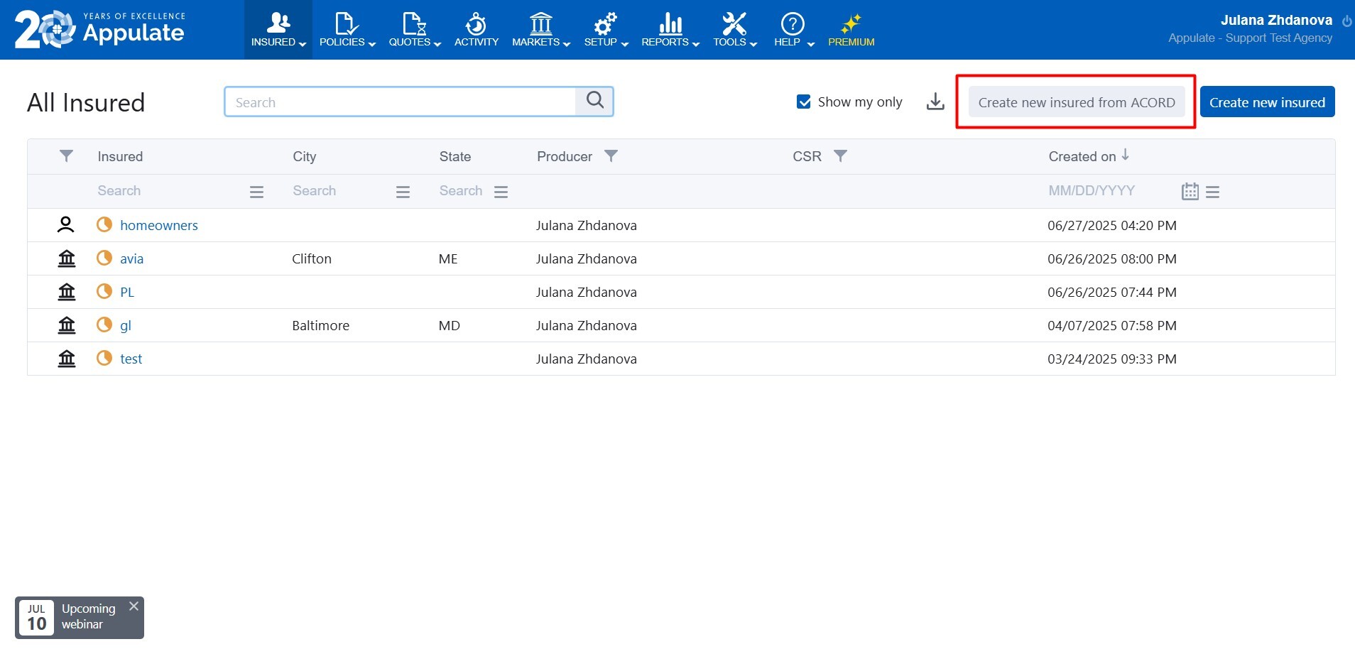5. If you have a completed ACORD for your insured, we can bridge it, so you are not rekeying any information, just click Create new insured from ACORD button, and it will open: