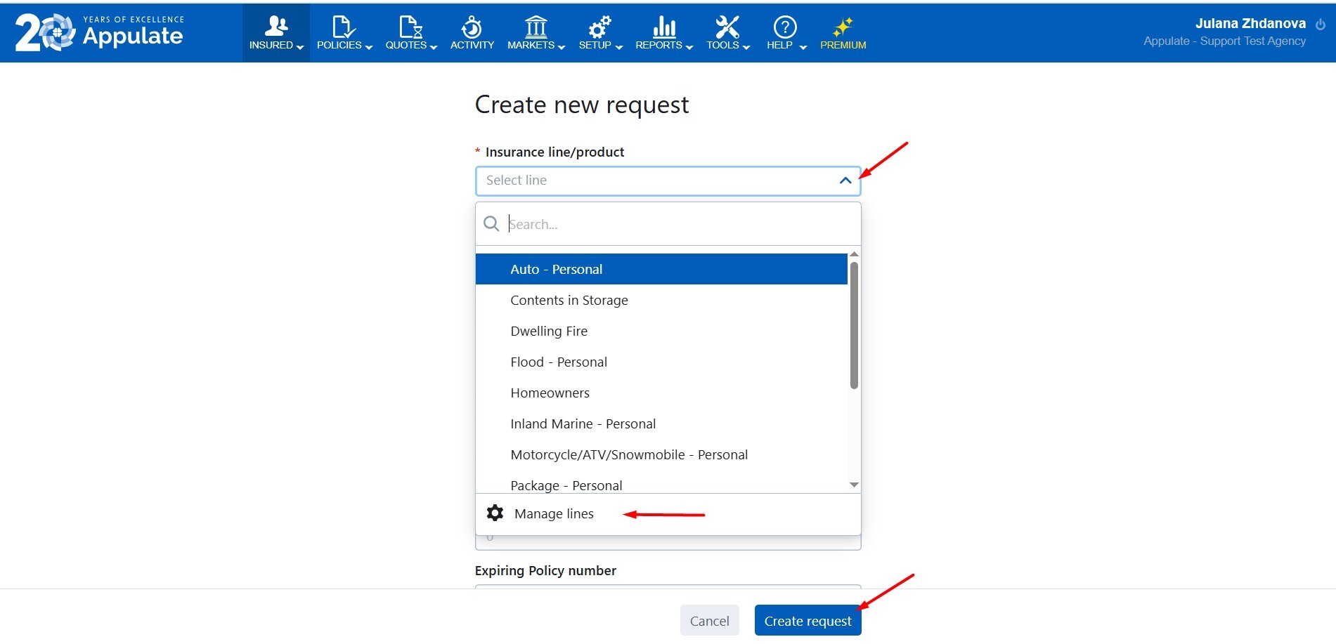 3. On the Create new request page, select a Personal line from the Insurance line/product dropdown.