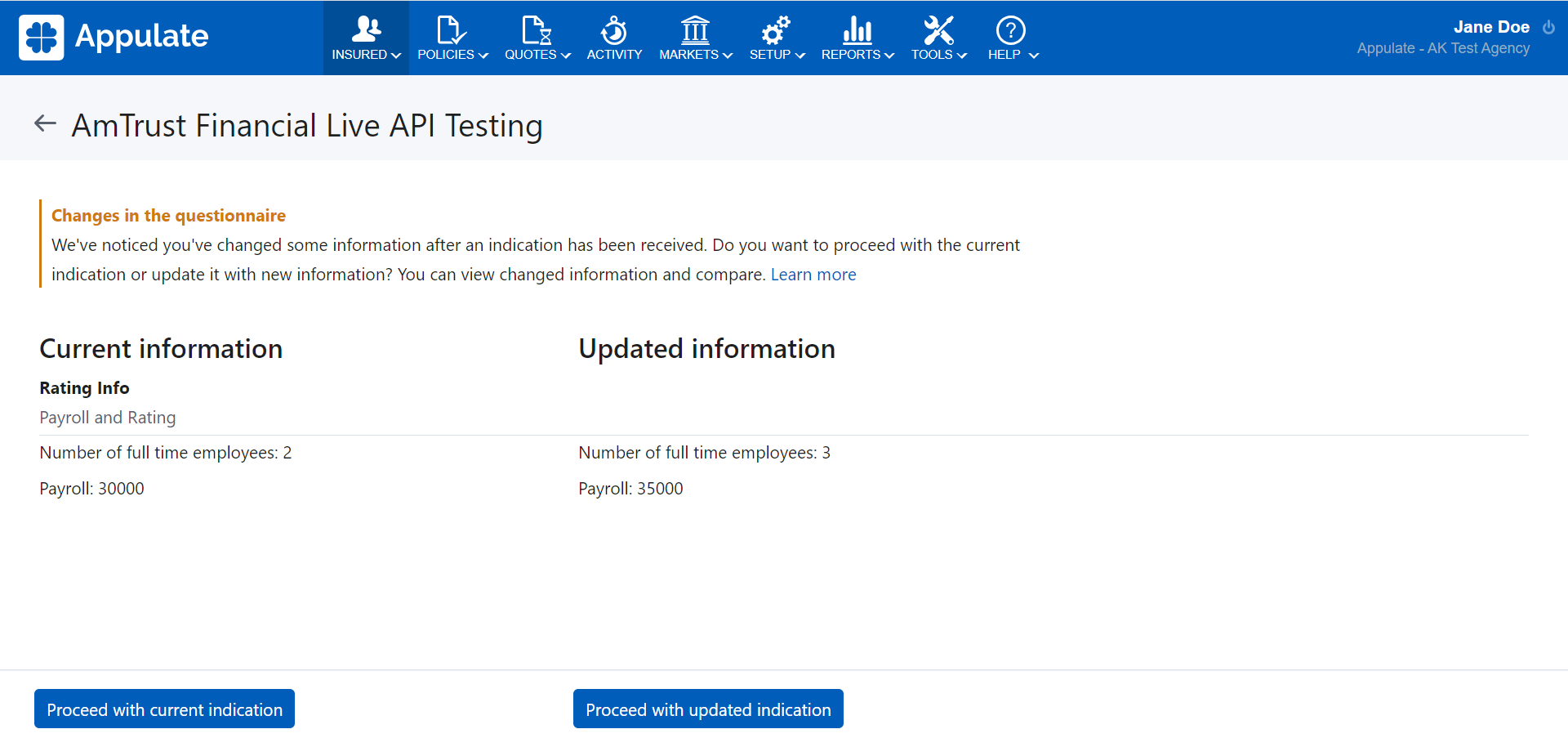 If you have received an indication or a quote but then changed some questionnaire answers, you can proceed with the current document or update it.