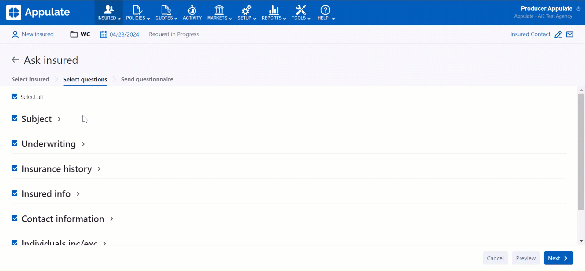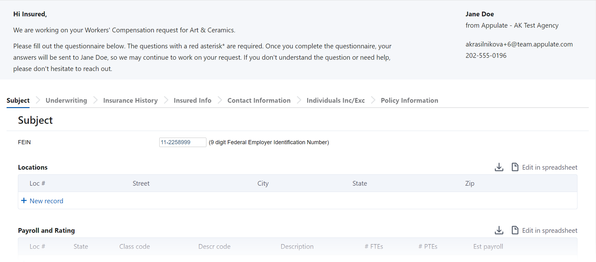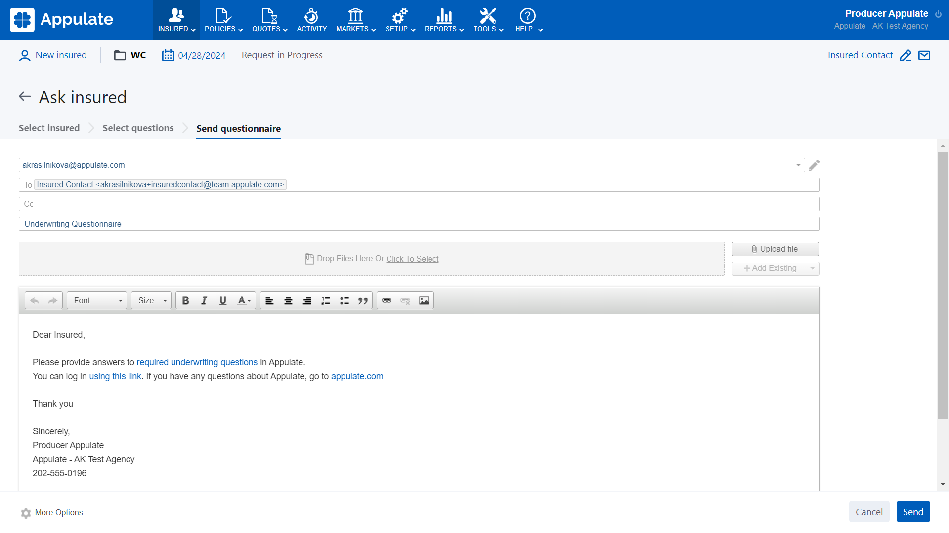 Appulate allows users to send questionnaires to the insured or others by email. Agents can customize the questionnaires for the insured. You can also send forms.