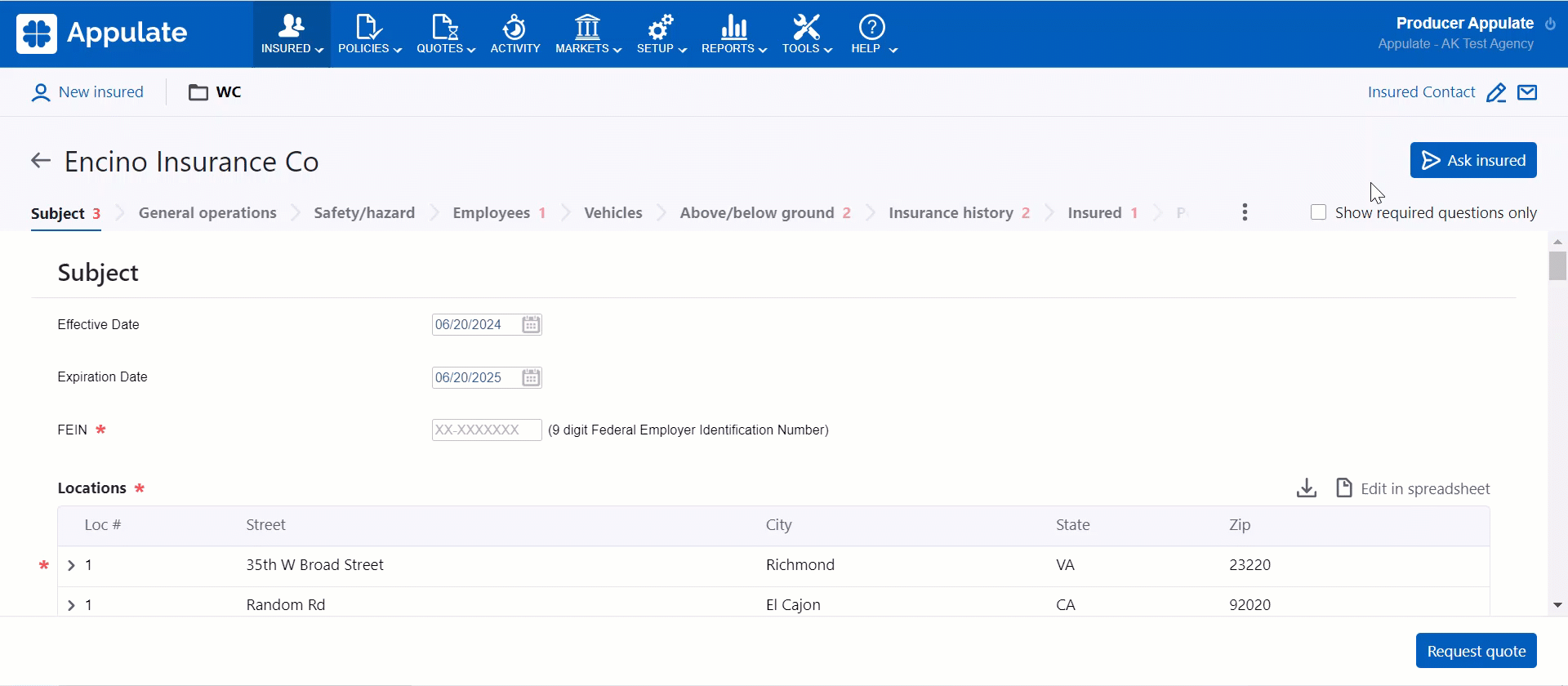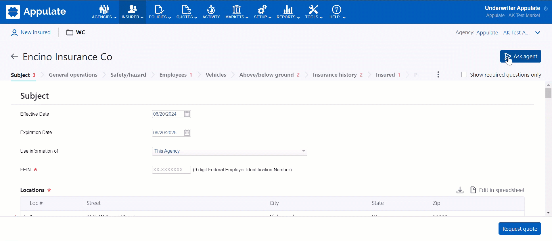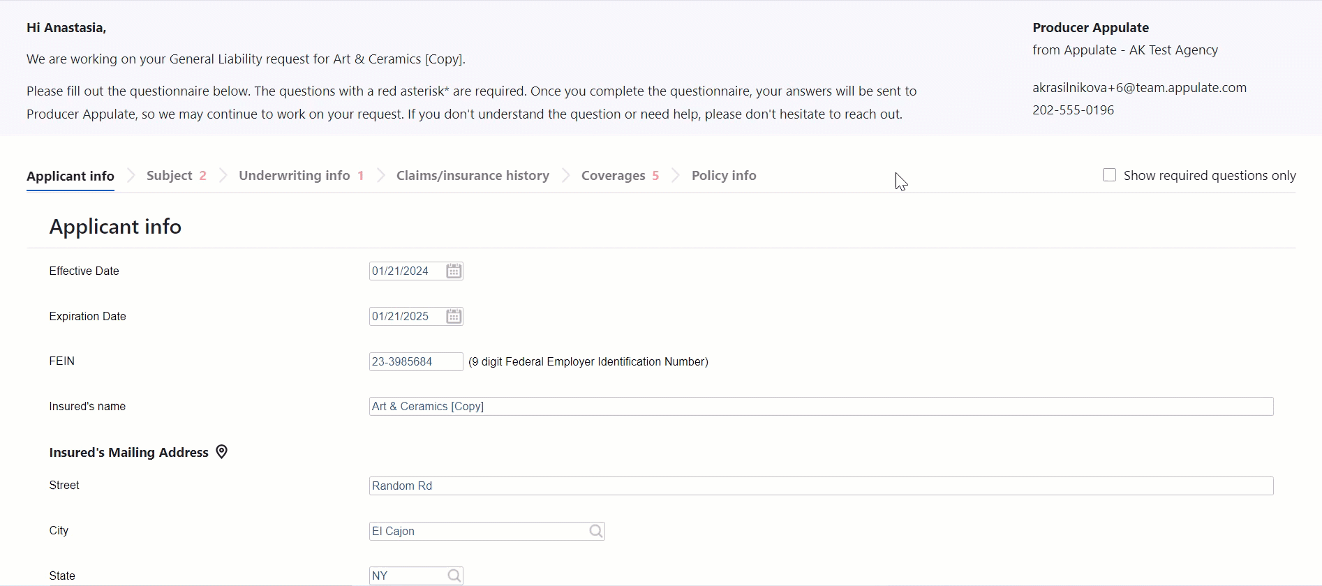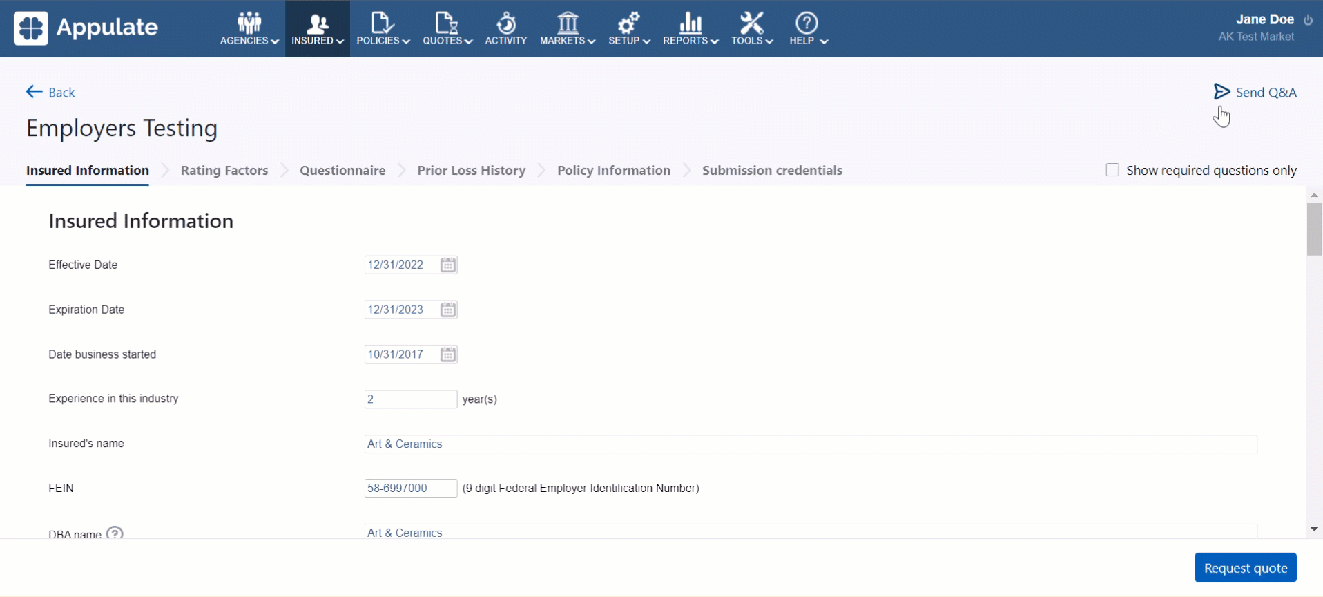 Appulate allows users to send questionnaires to the insured or others by email. Agents can customize the questionnaires for the insured. You can also send forms.