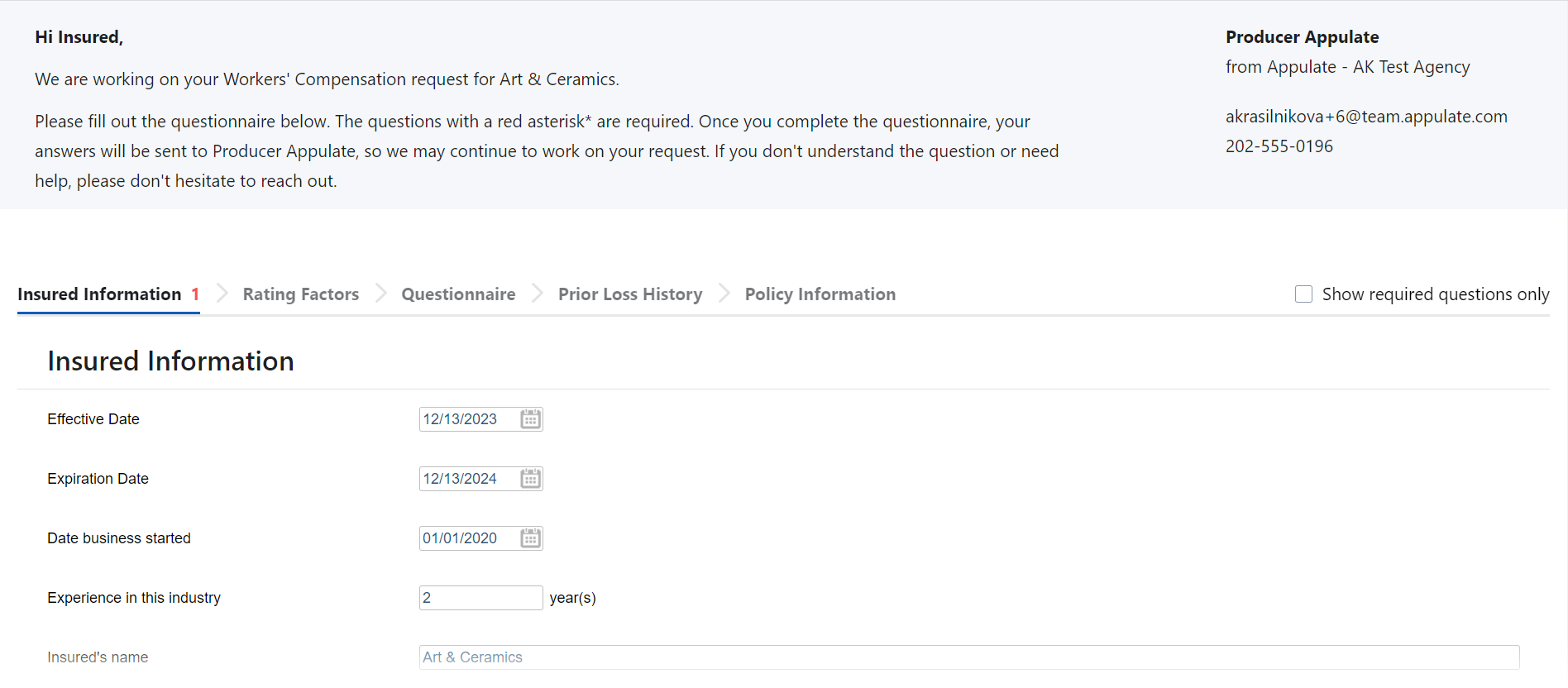 The recipient's questionnaire resembles those on the Insured tab, the Insured information policy page, the Forms tab, and on the Market Smart Q&A. However, there is no top menu. Instead, there is a header with an introduction text and the sender's contact information. The header will also display the sender's company logo if it's provided in Settings.
