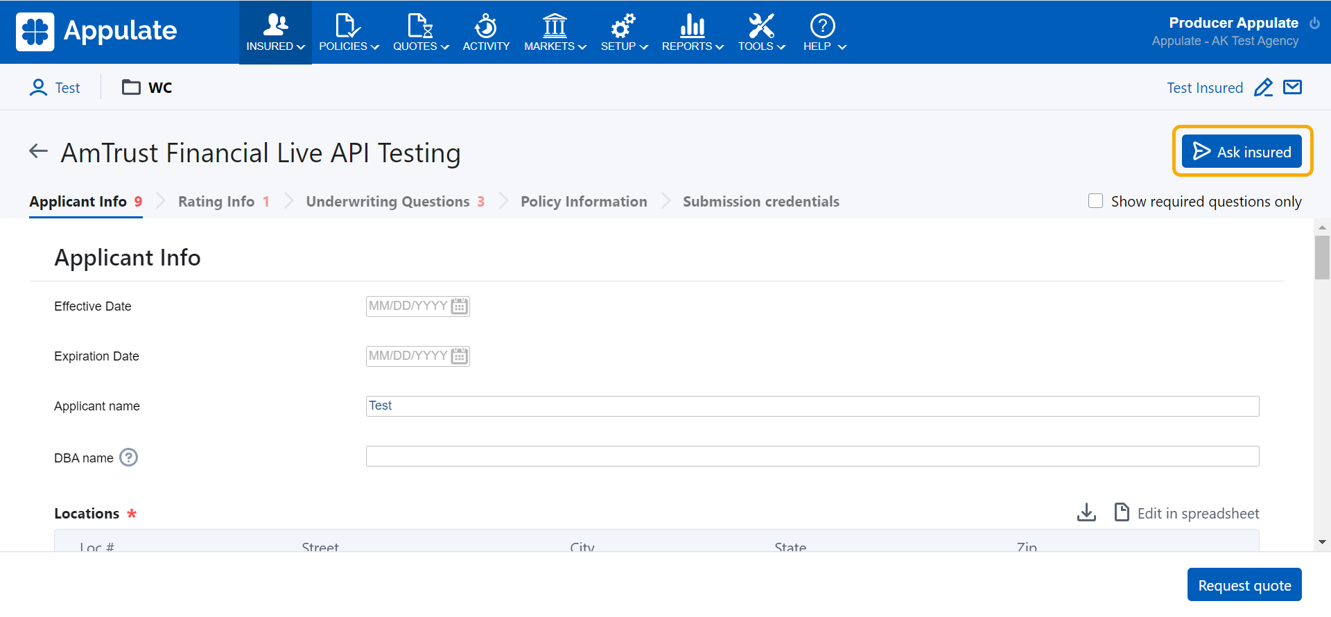 Send to complete (for agency users and market users) on the Policy > Insured information page.