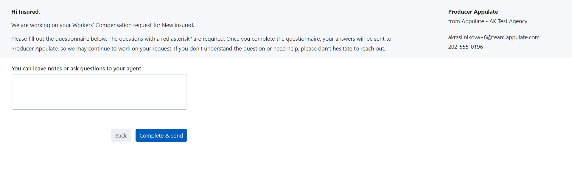 Once ready, click Send. The insured will get your email with a link to completing the questionnaire in Appulate. We will notify you when the questionnaire is ready.