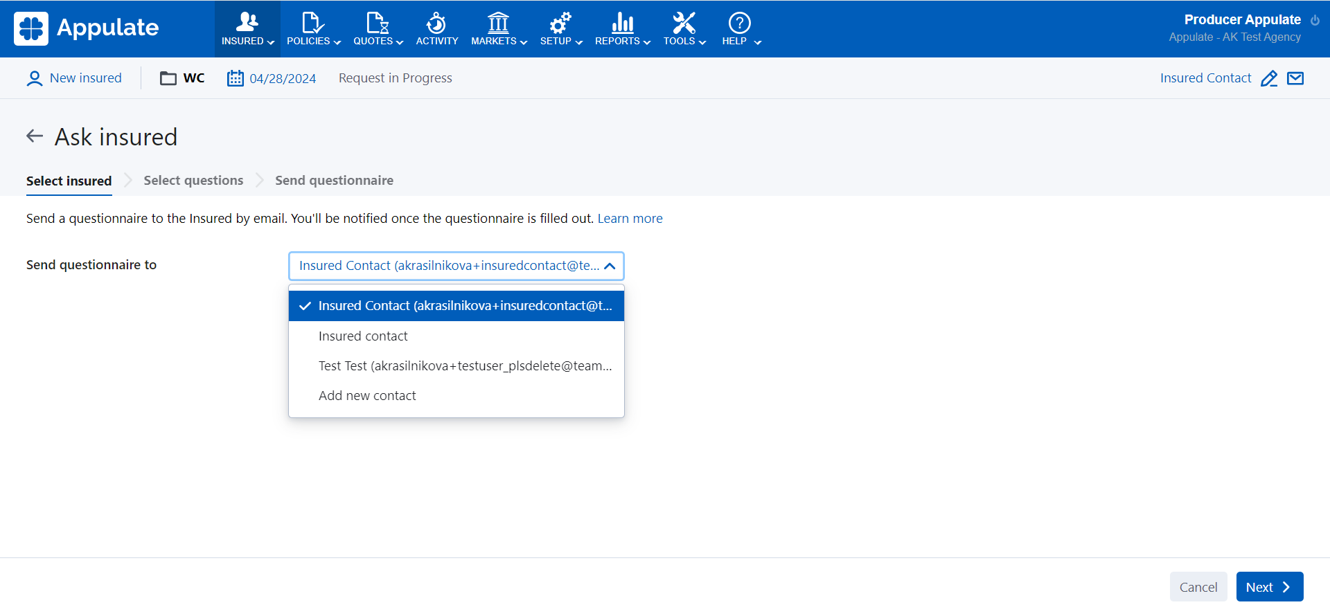 - The main insured contact for this quote request will be selected by default. You can send the questionnaire to a different insured. This insured user will then be made the main contact.