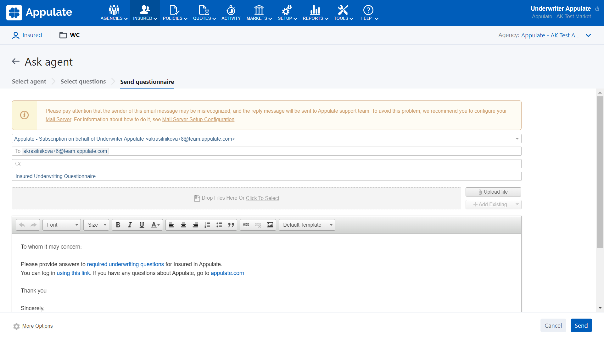 2. The Send questionnaire step contains an email with a template message. You can also type in your own message to send to the agent. Once ready, click Send.