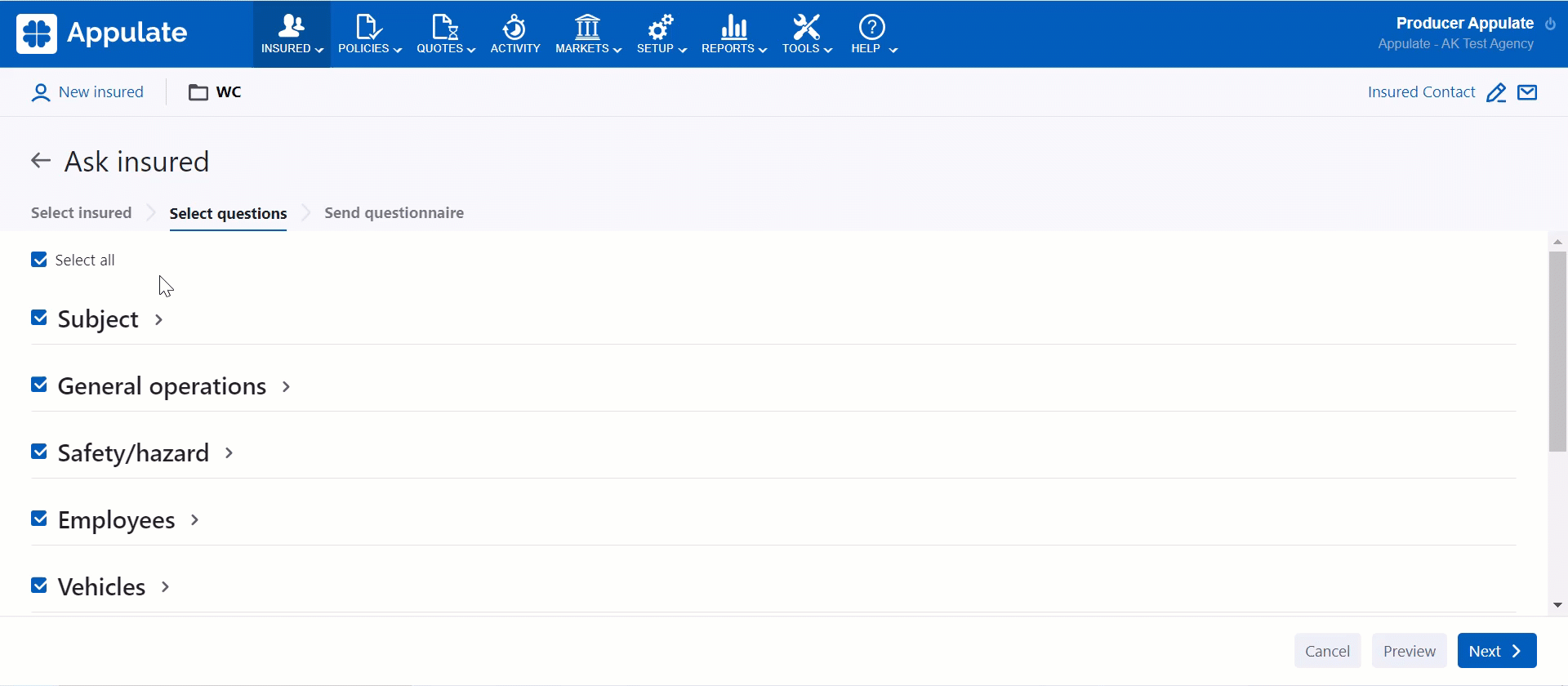 2. In the Select questions step, you can customize the questionnaire you'll send to the insured.