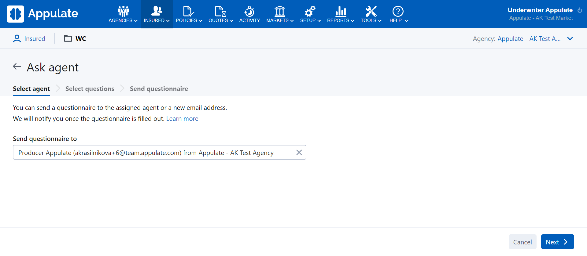 1. In the Select agent step, you need to select the agent contact who will receive the questionnaire.