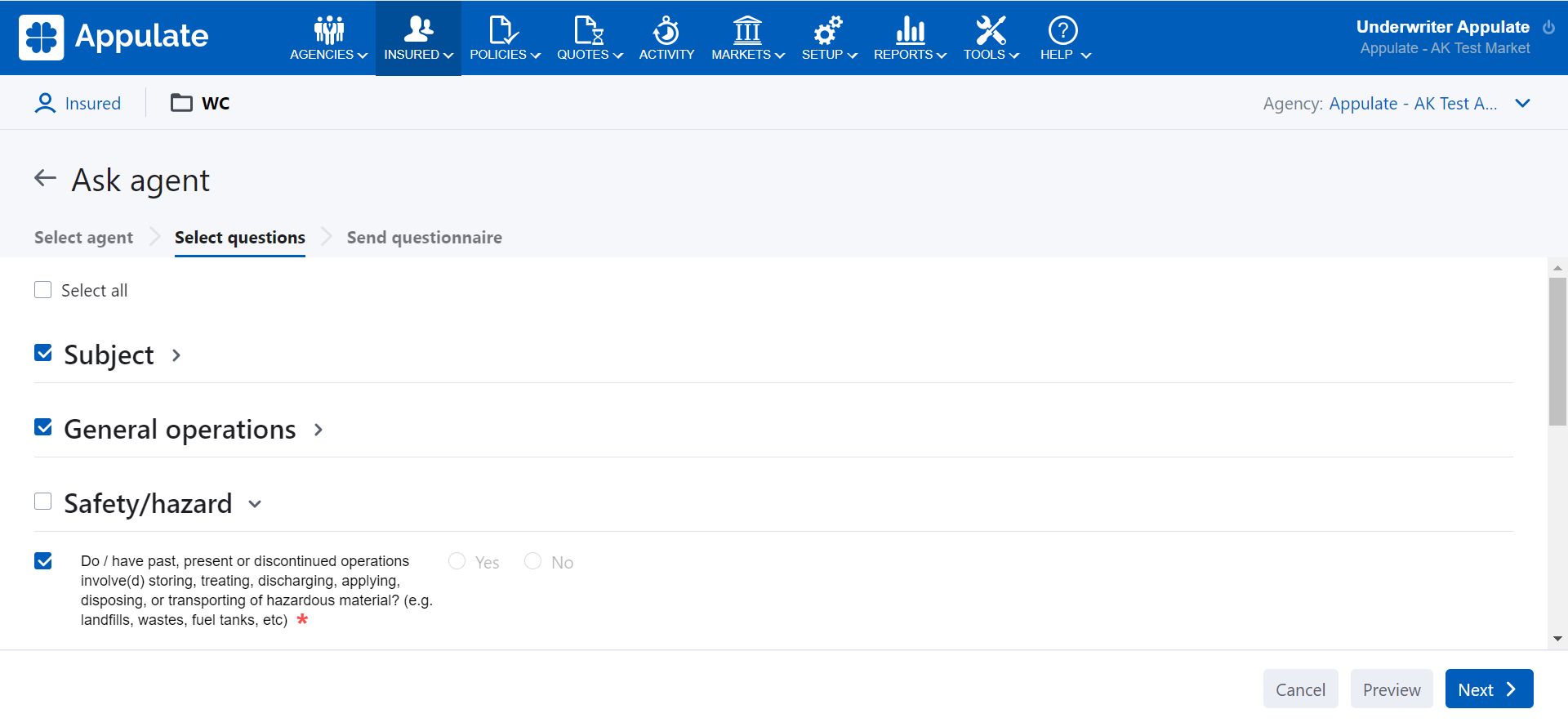 2. In the Select questions step, you can customize the questionnaire you'll send to the agent.