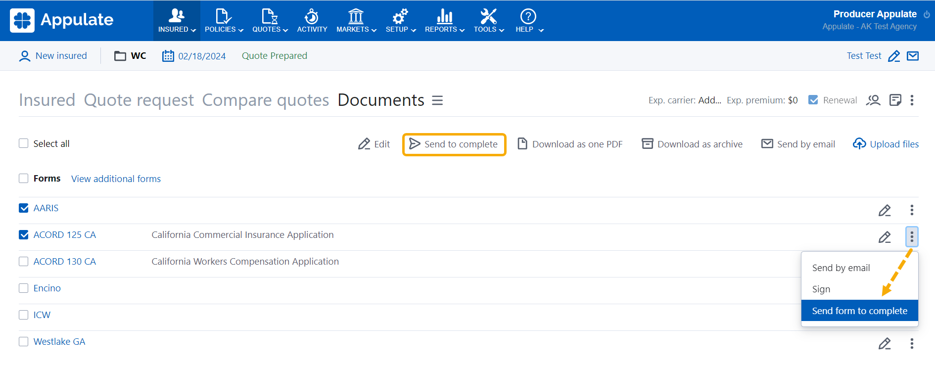 - on a quote request's Documents page: Send to complete (you can send one or several forms).