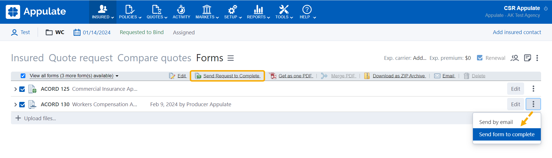 Appulate allows you to send forms (ACORD and Supplementals) to the insured or others by email. The following actions are available for quote requests: