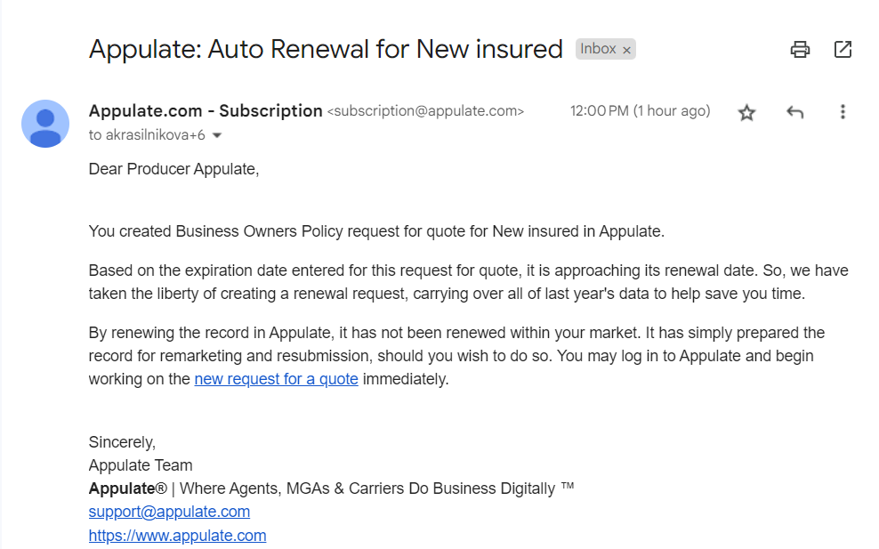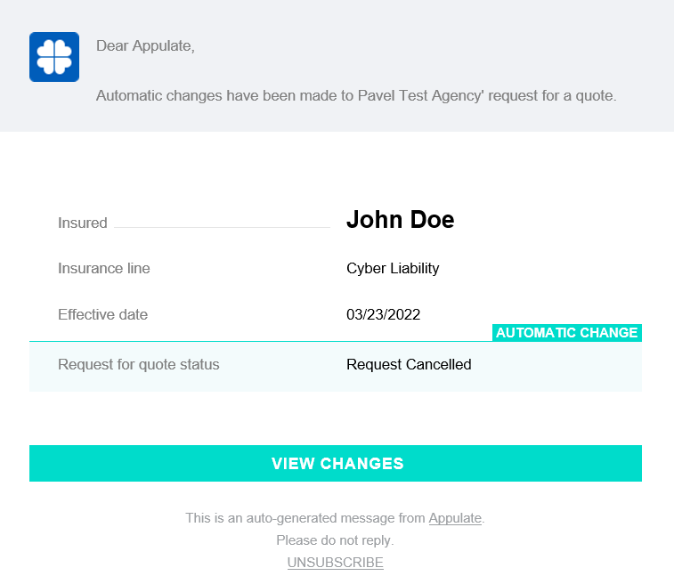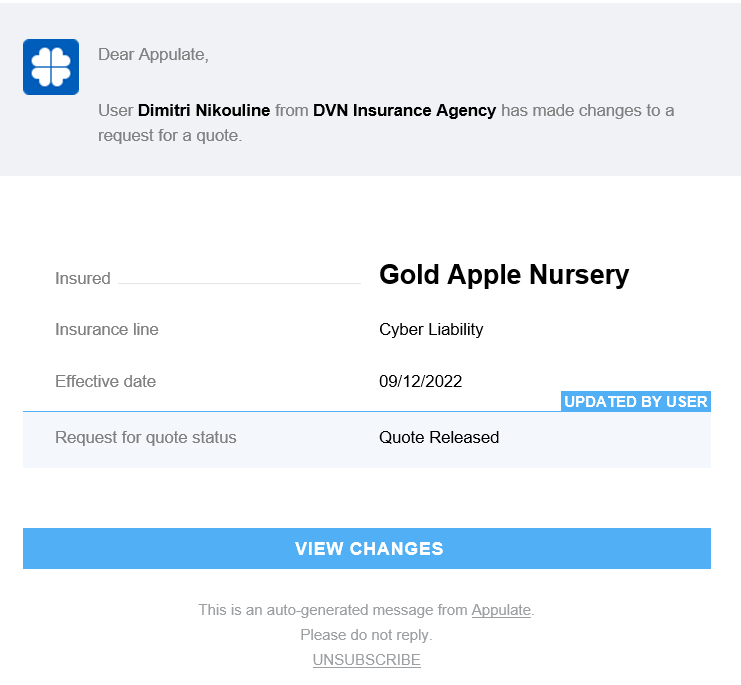 Appulate's status change notifications inform agencies and market users assigned to run a quote request or policy that any status associated with this quote request or policy has been changed.