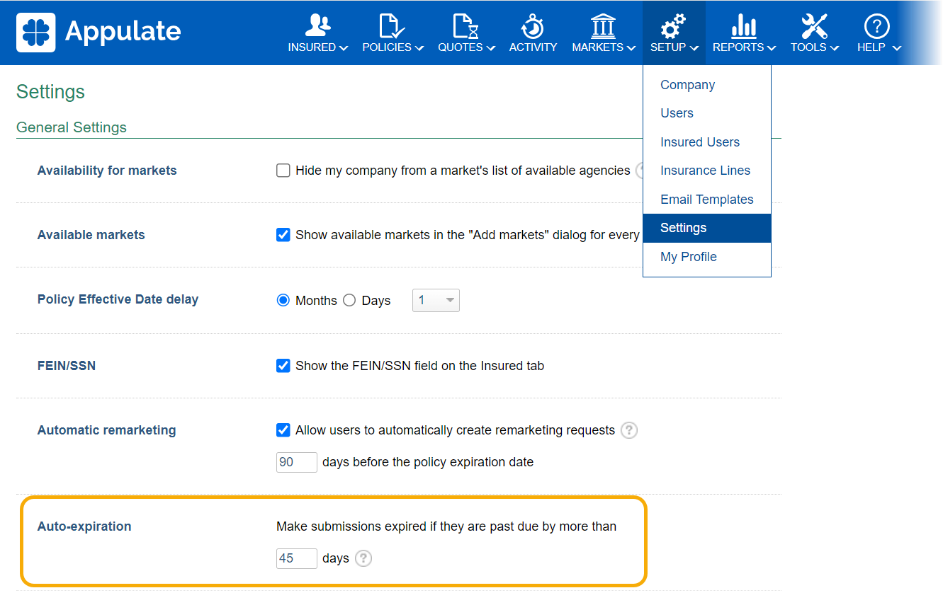 1. Click Settings on the Setup menu and find Auto-expiration under General Settings.