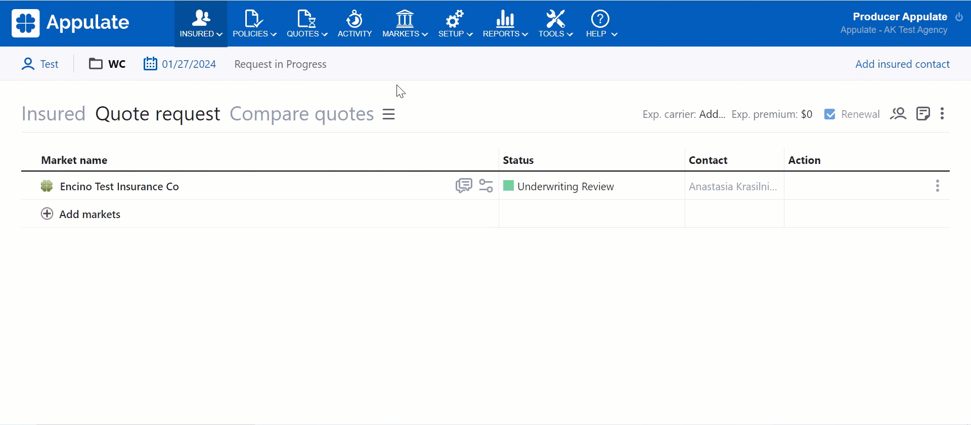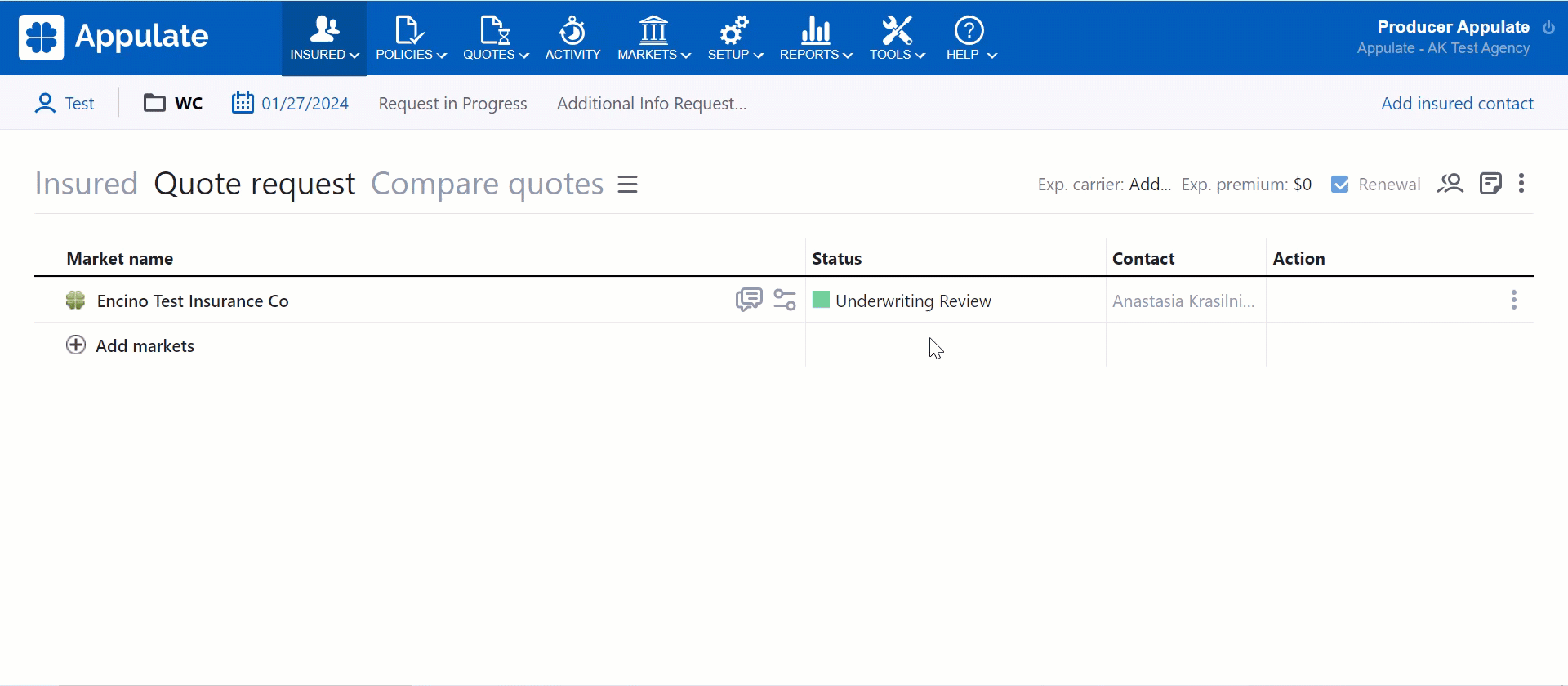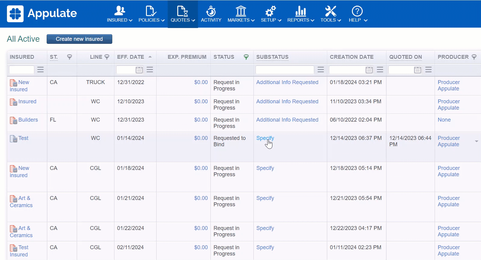 Apart from the Quote request page or the Policy page, the added substatus will appear in the Substatus column on the Quote and Policy menu pages, as well as on the Insured menu pages next to the insured's record status.