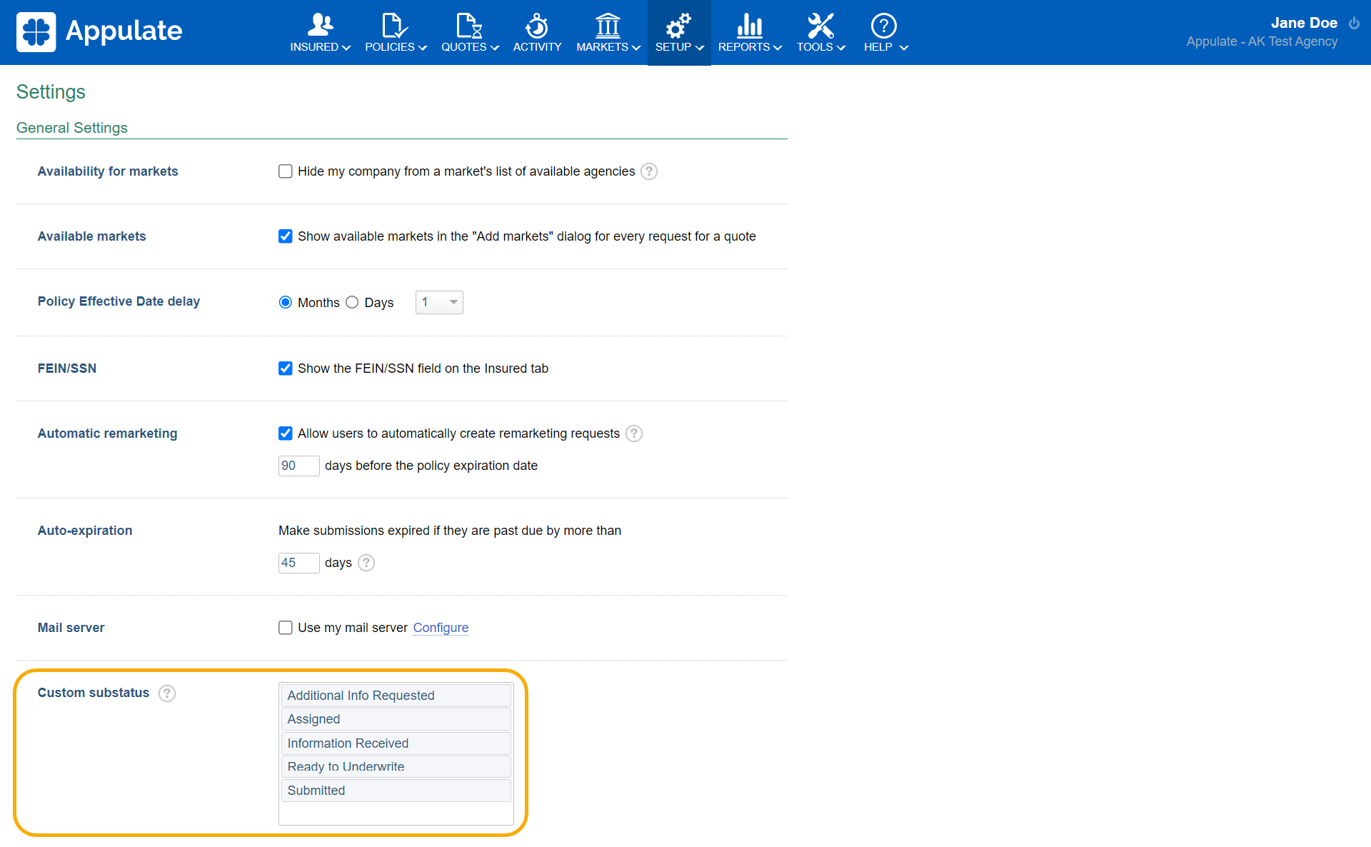 A substatus is a detailing of a regular status you can use to track your progress with a request for a quote or policy. There are record substatuses and submission substatuses. You can choose a default substatus or add your own.