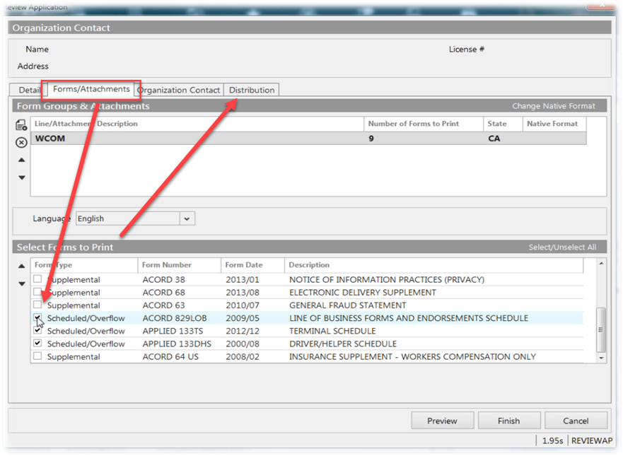 3. Under Forms/Attachments, you will see a list of preselected forms. Unselect forms that you don’t need. Then navigate to the Distribution tab.