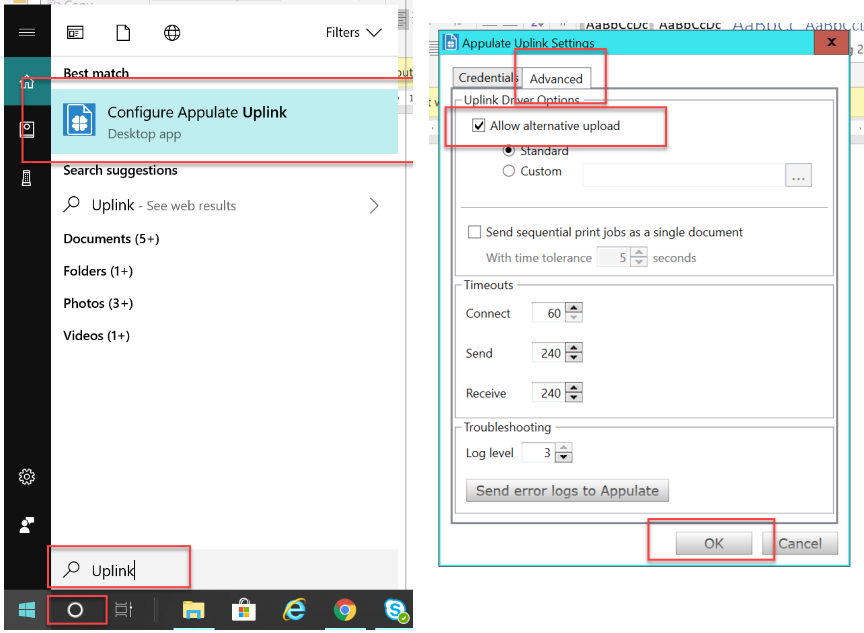 Important: Before getting started, for SIS Partner XE an extra feature must be configured for Uplink. Once installed, search your computer for Uplink and select Configure Appulate Uplink. In the Appulate Uplink Settings pop up, click the Advanced tab, check the box next to Allow alternative upload, and click OK.