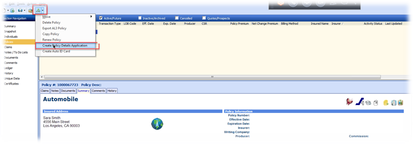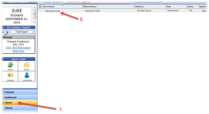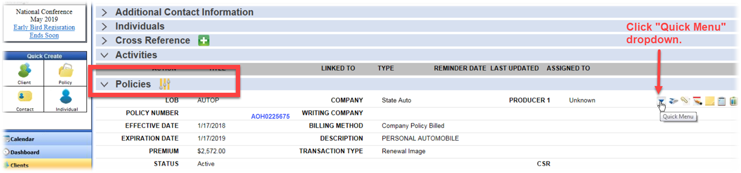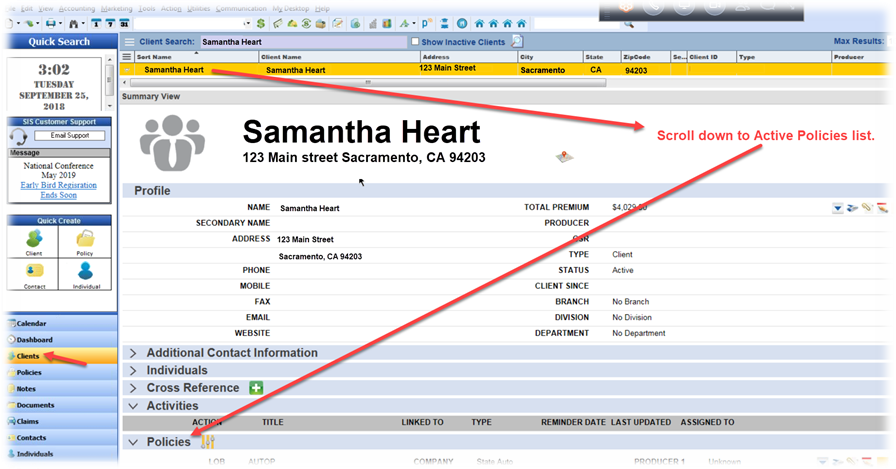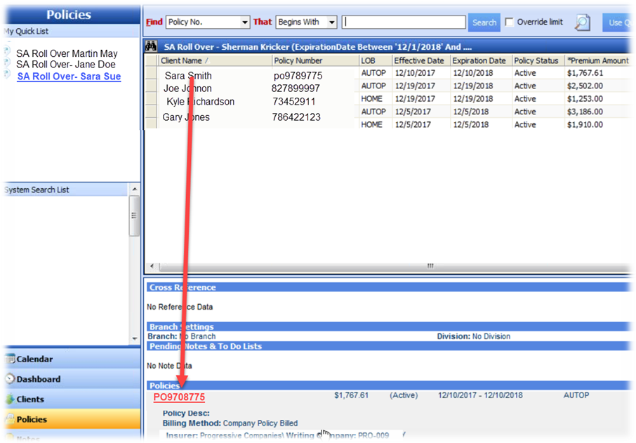 2. Click on the client’s name and scroll down to Policies and click on the policy number.