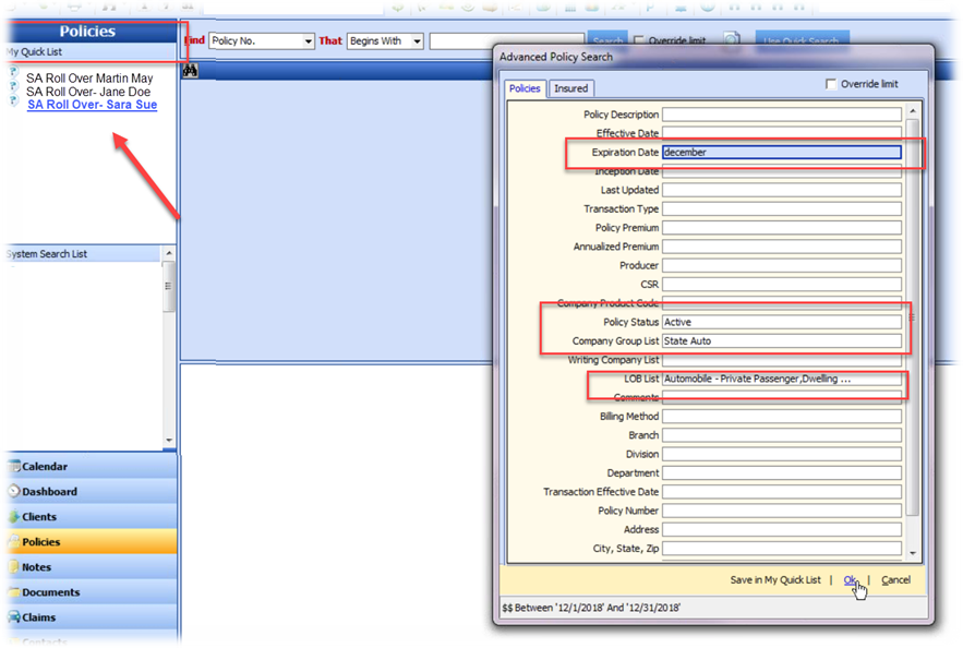 1. Under Policies, navigate to your Quick List and make your selection. In the Advanced Policy Search pop up, set your search criteria, and click OK.