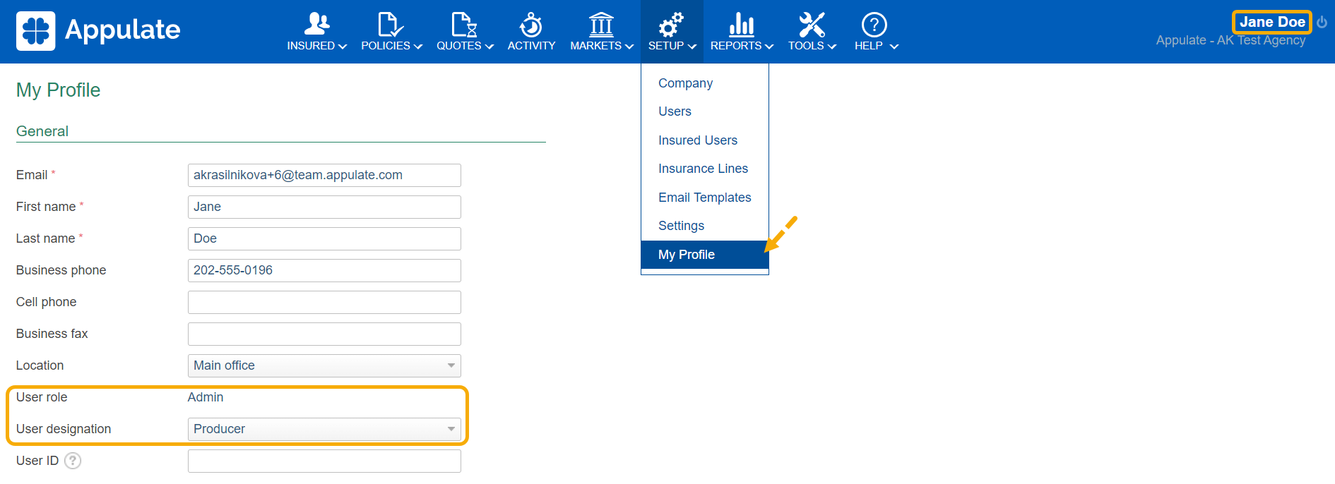 You can view your role and designation on your profile page. To open it, click your name in the top-right corner of any Appulate page. You can also select My Profile in the Setup menu.