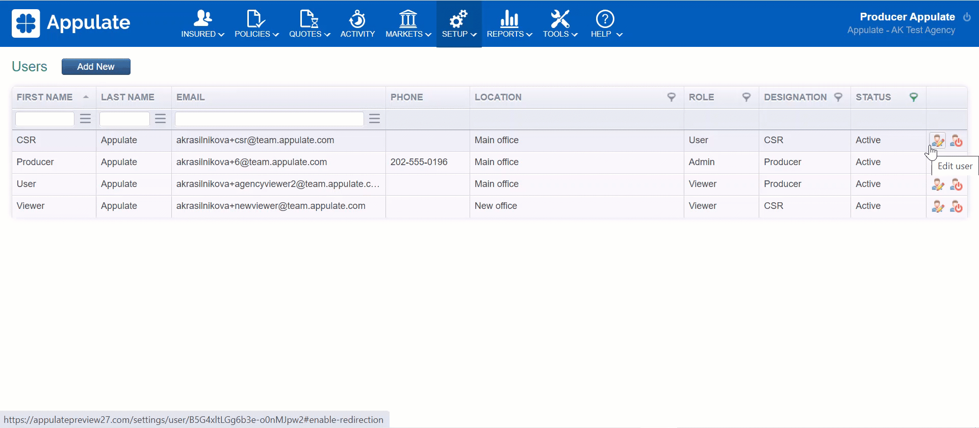Tip: If you want to add a new Producer or CSR to assign to a quote request or policy, go to Setup > Users and click Add New. This is only available to company Admins.