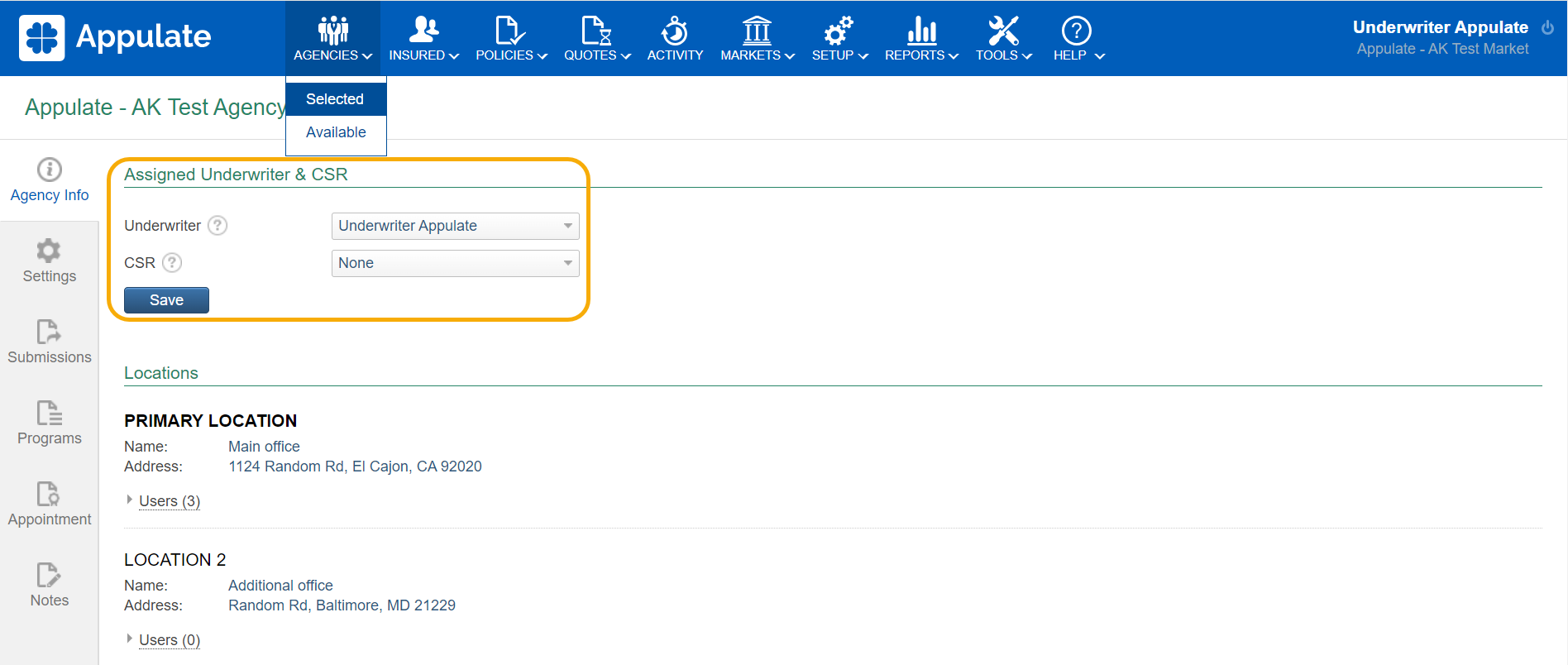 Moreover, you can assign an Underwriter and CSR to an agency as a whole on its Agency Info tab (Agencies > Selected > click an agency to open its page). These users will be automatically assigned to all incoming quote requests from this agency.