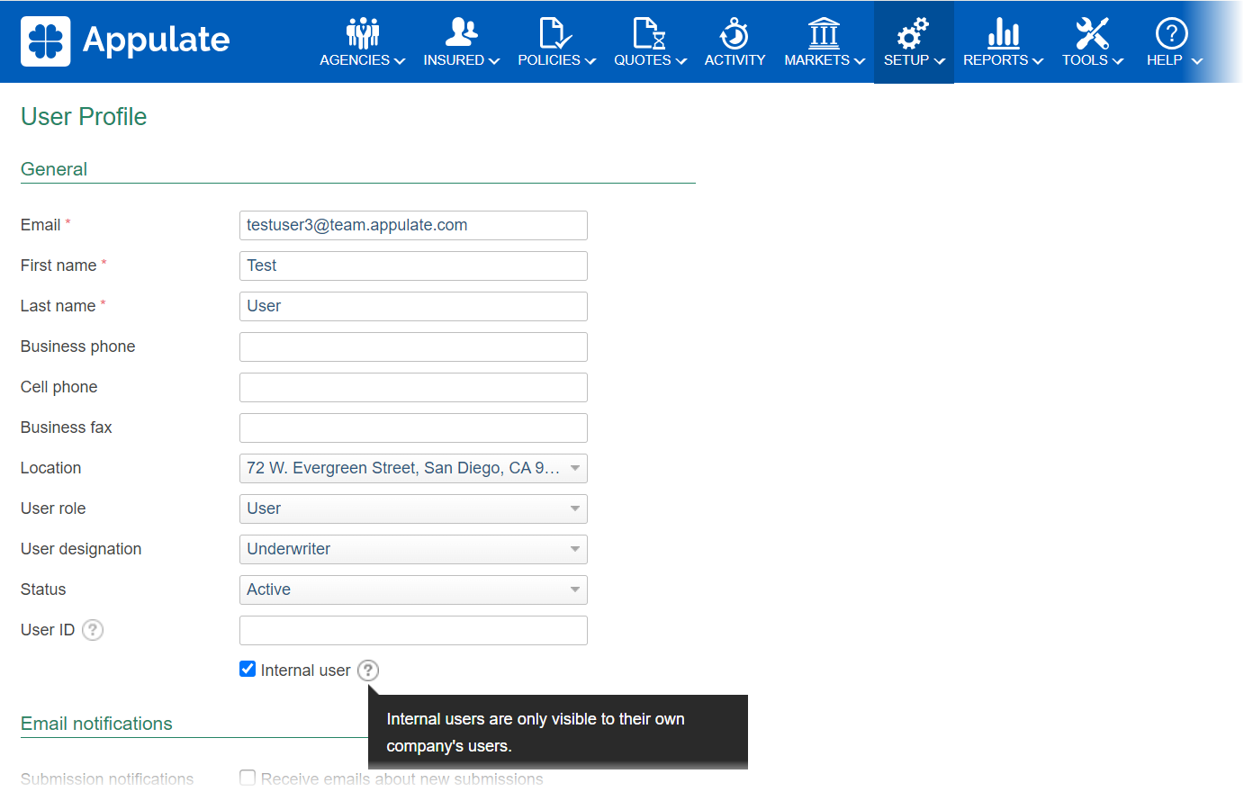 Tip: If you want to add a new Underwriter or CSR to assign to a quote request or policy, go to Setup > Users and click Add New. This is only available to company Admins.