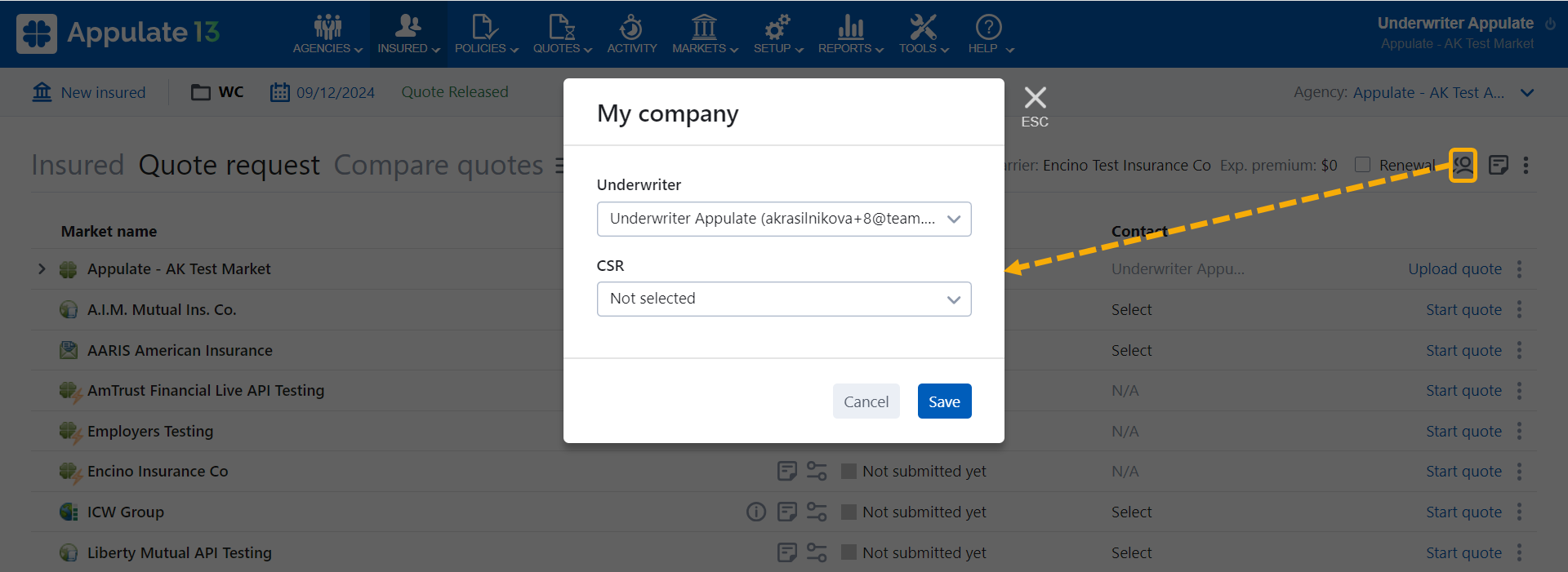Since markets with the Appulate submission type use Appulate for their main workflow and get informed about each quote request, they assign the Underwriter and CSR themselves.