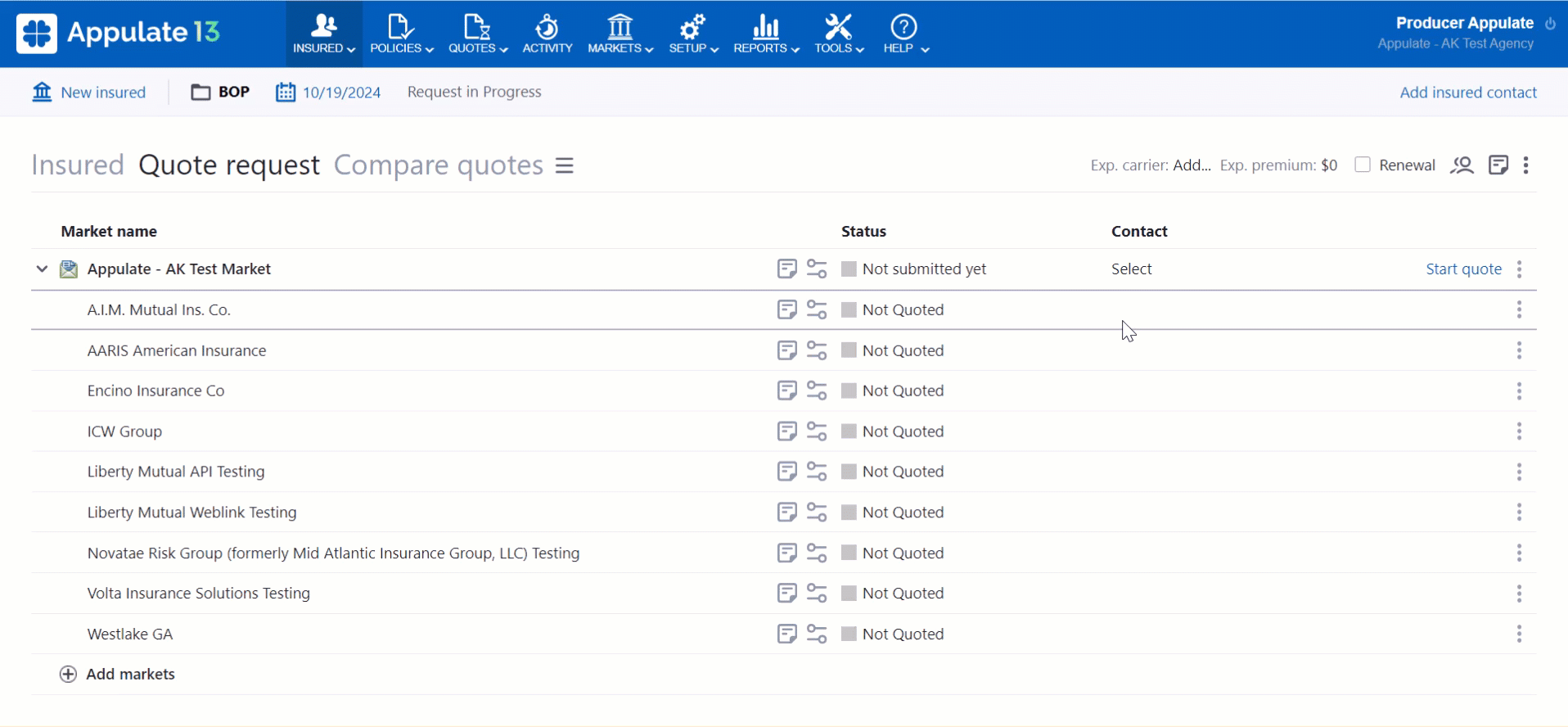 - a Producer (applicable to agencies) runs quote requests and policies for the insured.
