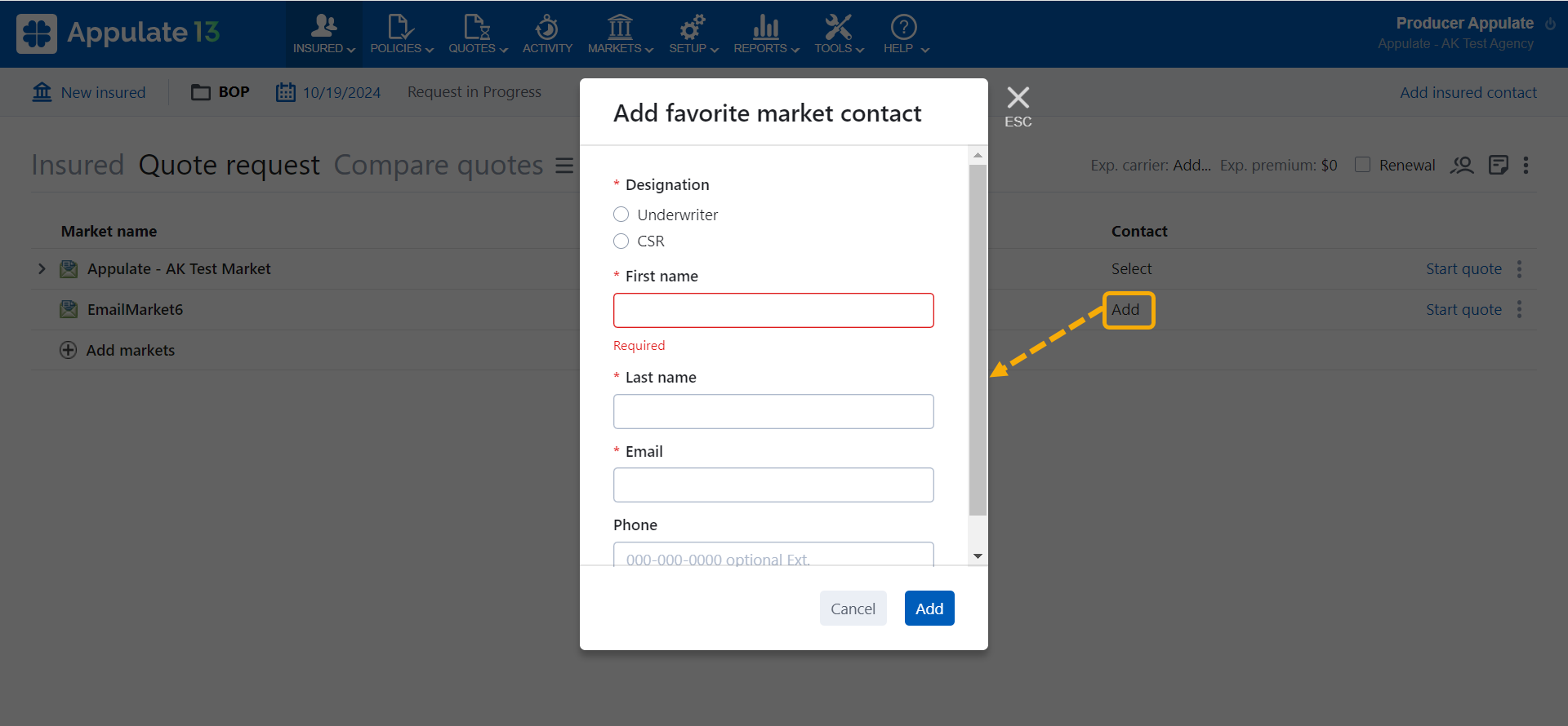 Note: If an agency creates a quote request or policy and sends it to a market, the market won't be able to change this assigned agency, as well as the assigned Producer and CSR.