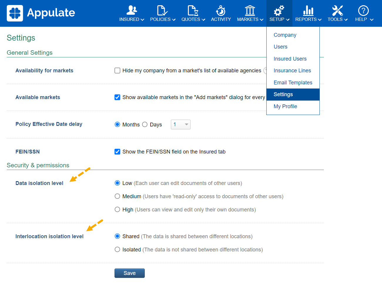 - Isolated: A company user has access to the permitted entities belonging to the user’s location only. An entity is considered to belong to a location if any user from this location is assigned to this entity as a producer or CSR.