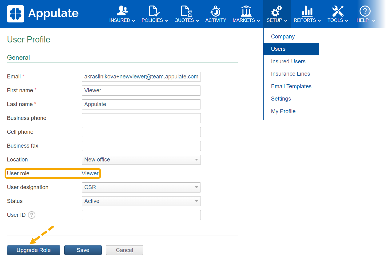Note: You cannot change your own user role, even if you are an Admin. Another Admin has to do it for you. The Insured User role also cannot be changed.