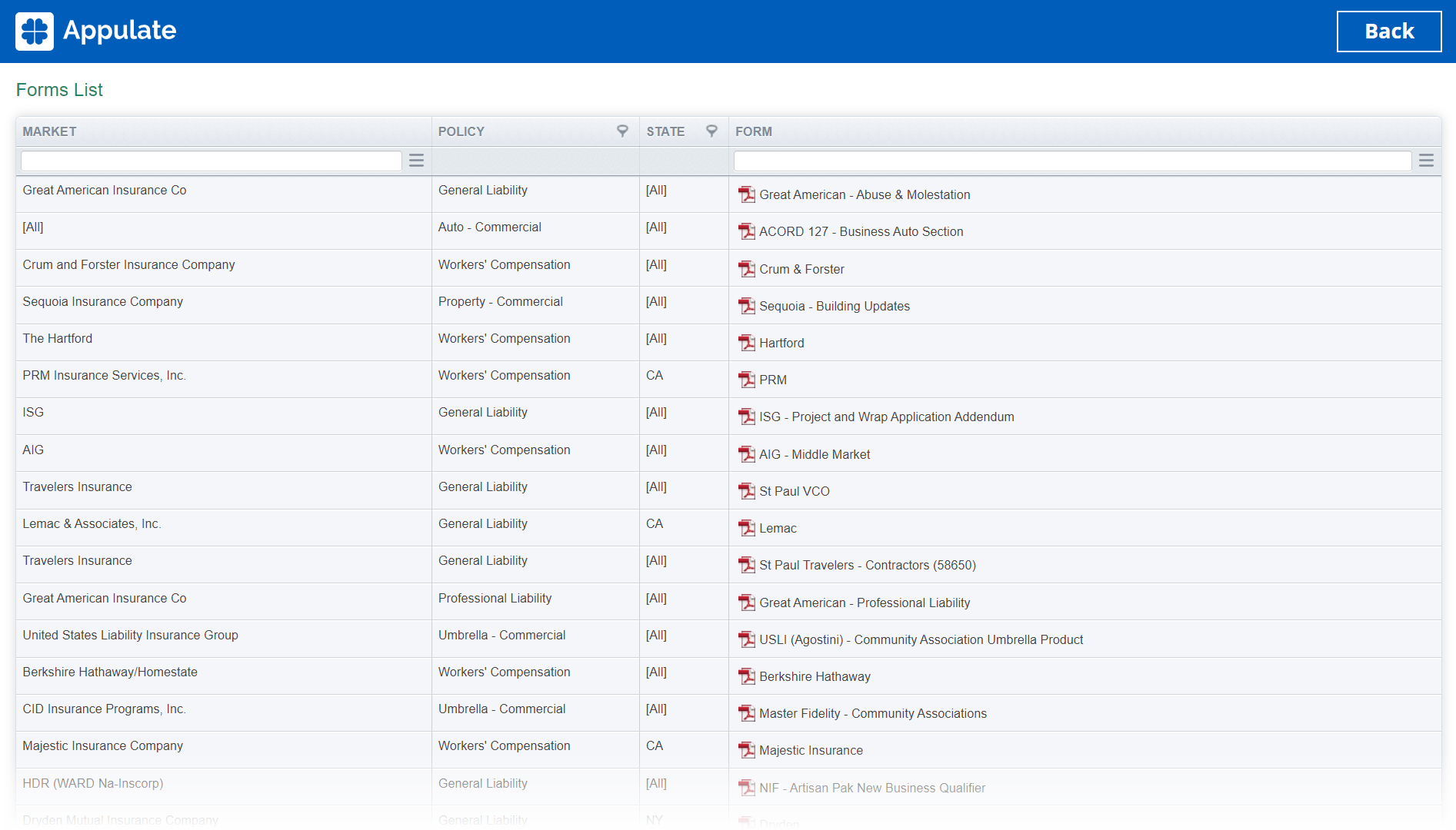 Appulate's Forms List page (appulate.com/formslist) has blank ACORD and Supplemental forms provided by markets.
