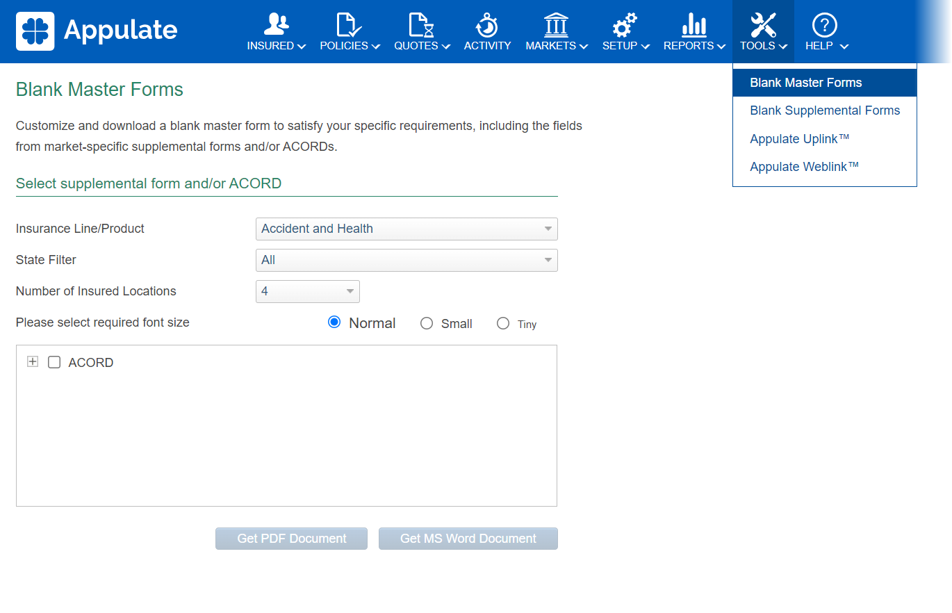 Another option to get a blank ACORD or Supplemental form is using Blank Master Forms or Blank Supplemental Forms in the Tools menu.