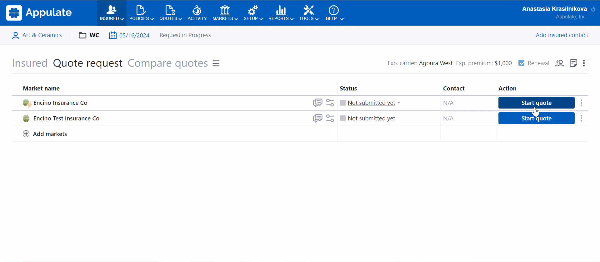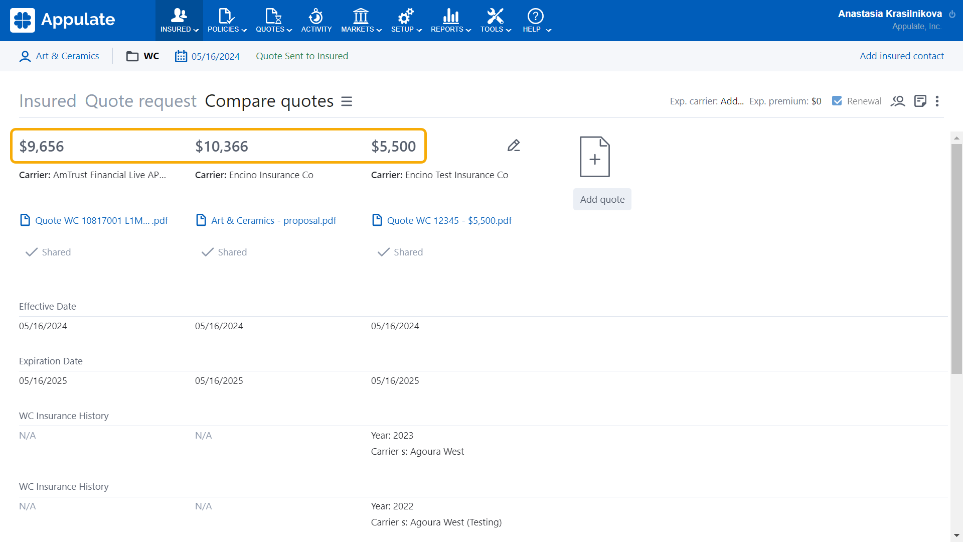 The Compare quotes page displays the premiums of all the quotes available for your company and this insured.