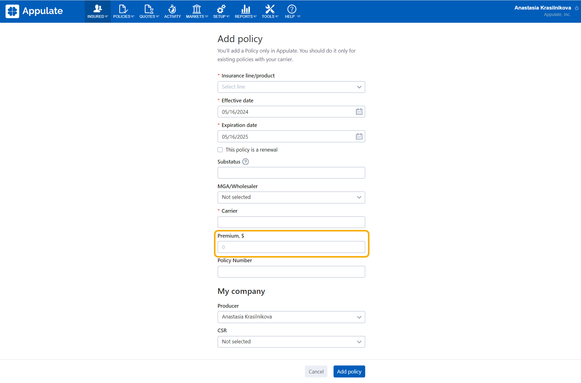 You can view a policy's premium in the Total Premium field on the Policy page. This is the premium of a quote on the basis of which this policy was bound, including any taxes and surcharges.